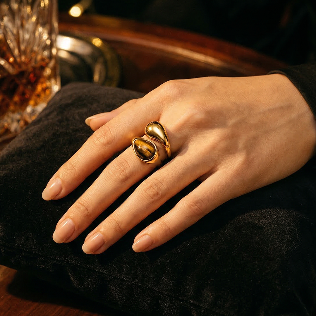 Trendy 18K gold plated stainless steel adjustable ring featuring a natural Tiger Eye stone with channel setting. Waterproof, hypoallergenic, and durable design perfect for daily wear, parties, anniversaries, and gifting. Promotes protection, confidence, and mental clarity while adding a stylish touch. Suitable for women and unisex wear.